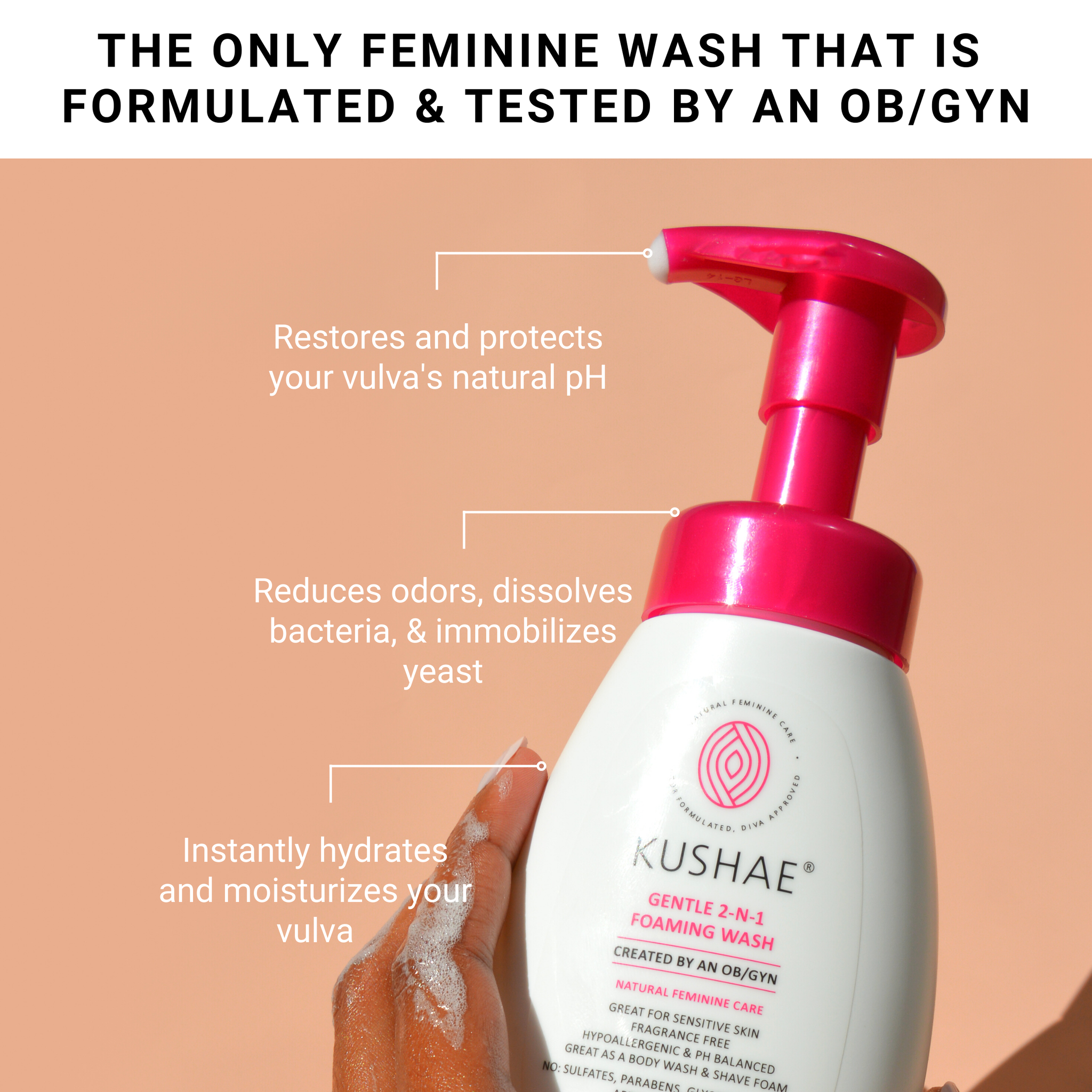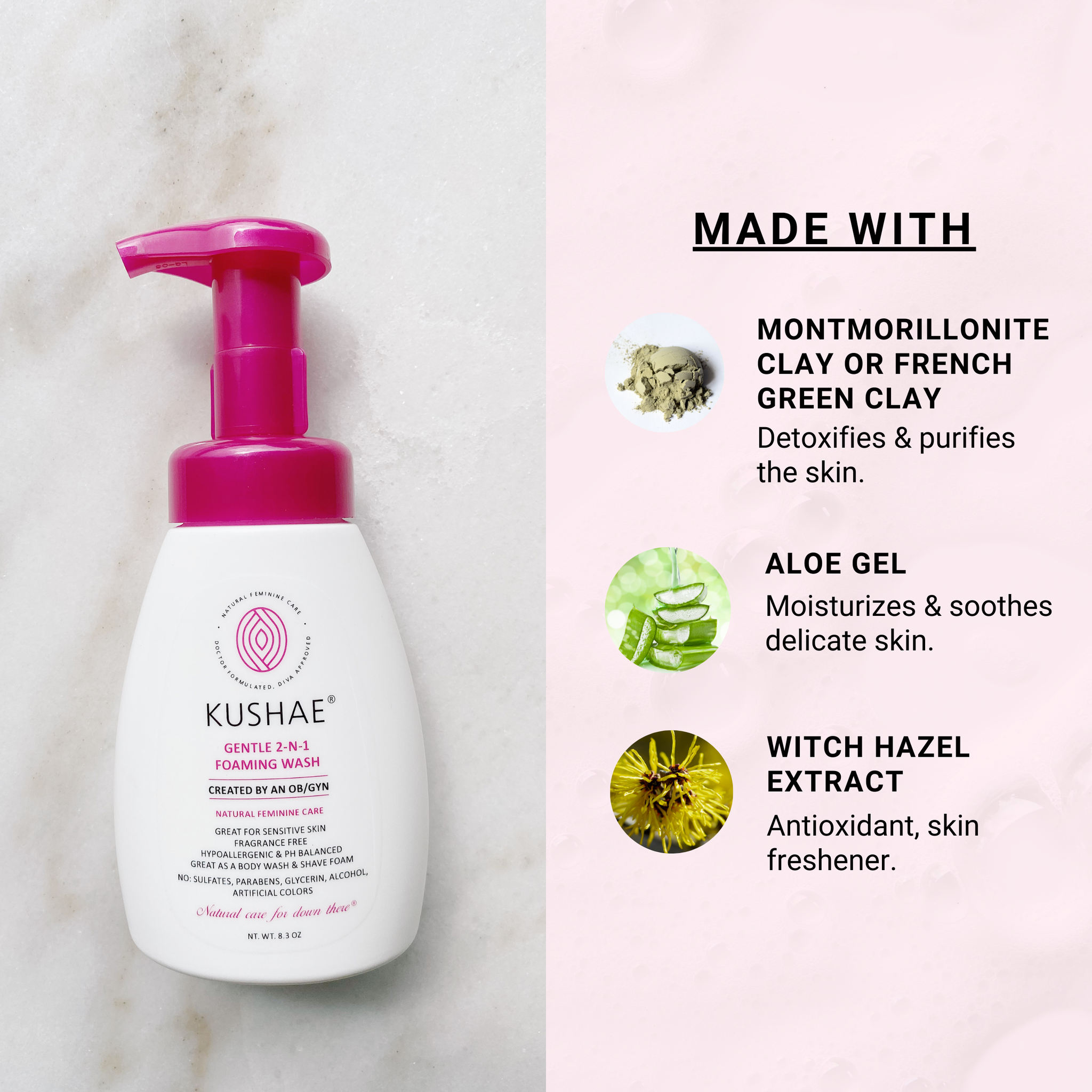 Our Gentle 2-N-1 Foaming Wash – created by an OB/GYN – leverages naturally mineral-rich Montmorillonite clay (from western France) to create perfect pH harmony, reduce odors, dissolve bacteria, and immobilize yeast where you need it most.