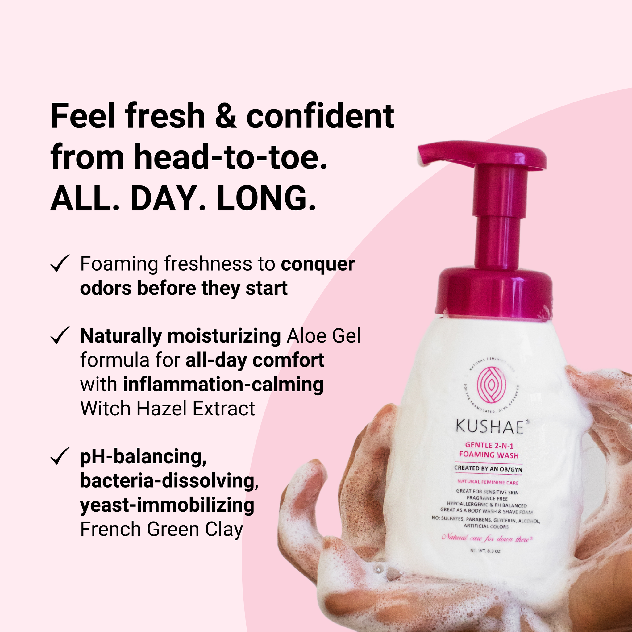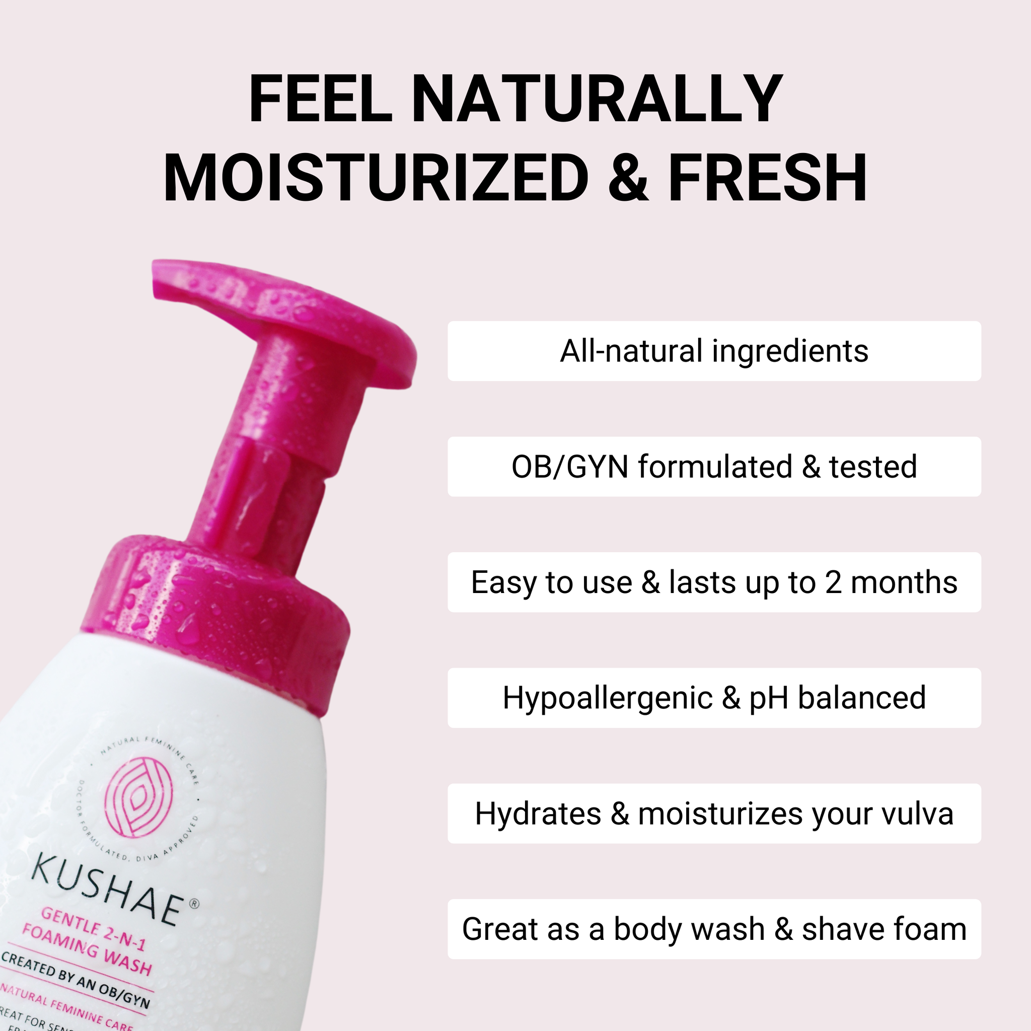 From funky to fresh… All over. All day. This “Montmorillon Miracle” gentle 2-N-1 foaming vaginal wash cleanses and moisturizes your vulva and body. You can even shave with it!